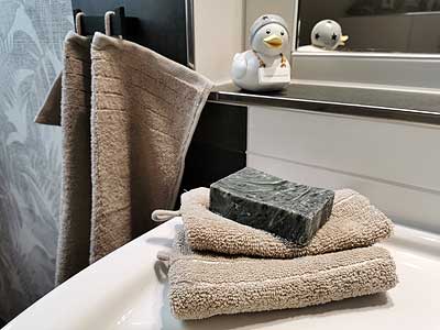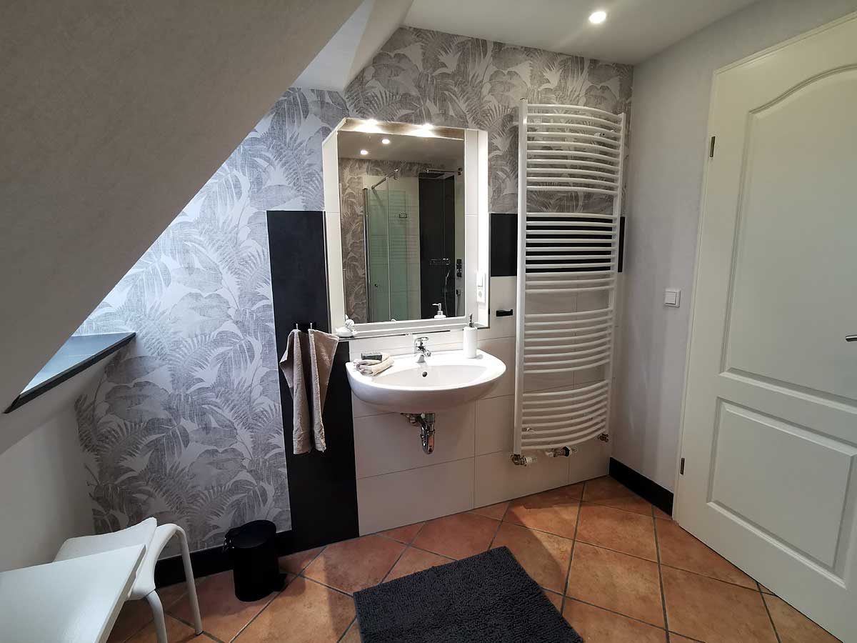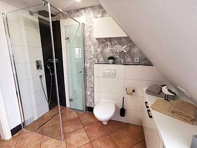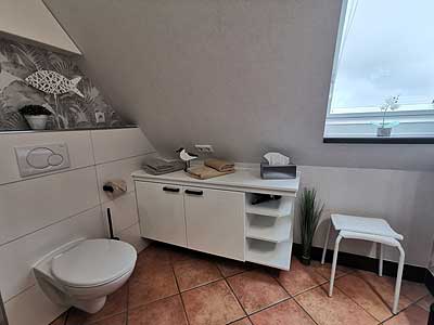 in Utersum auf FöhrDas Badezimmer bietet eine Größe von ca. 6qm und besitzt eine ebenerdige Dusche von 90x90 cm. Außerdem befindet sich im Badezimmer ein Kosmetik Spiegel, ein Handtuch Trockner und ein großer Schrank, damit die Utensilien aller Bewohner ihren Platz finden. In einem kleinen Schrank im Bad, etwas höher angebracht damit die kleinen nicht ran kommen finden sie ein paar Putz Sachen, damit die Dusche nicht nach 3 Wochen undurchsichtig wird.
