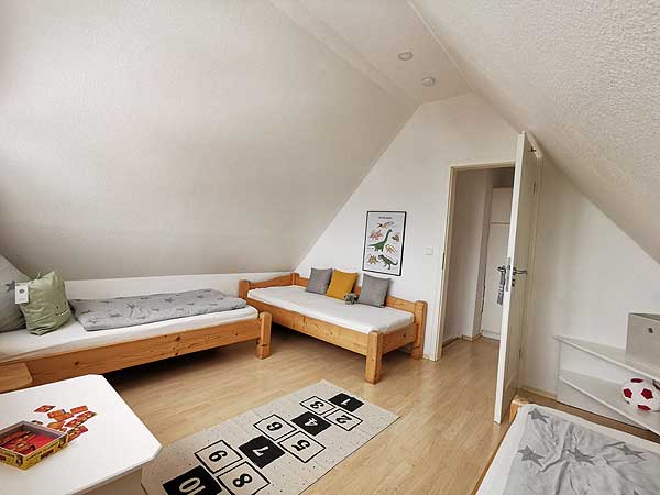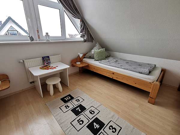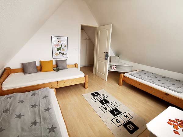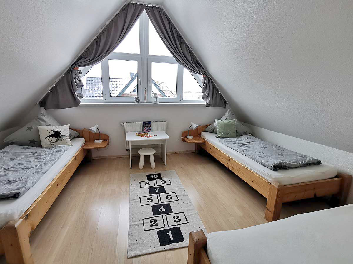 in Utersum auf FöhrDas Kinderzimmer im Dachgeschoss hat eine Größe von ca. 14qm und bietet Platz für 3 Personen. Der Fußboden ist wie im Eltern Schlafraum mit Laminat ausgelegt und die Betten haben eine Größe von 90 x200cm. Hier gibt es auf Wunsch für die Kleinen Gäste einen Treppenschutz, Bettgitter oder Nässeschutz für die Matratze. Ein wenig Spielzeug damit sich Ihre Sprösslinge nicht langweilen ist ebenso vorhanden. Gerne möchten wir vor der Anreise wissen ob sie Mädchen oder Junge mitbringen sowie eventuelle Vorlieben erfahren, damit sich Ihre Kleinen auf Anhieb bei uns wohl fühlen. Im Vorraum des Kinderzimmers befindet sich ein ausreichend großer Einbauschrank für die sieben Sachen der neuen Bewohner.
