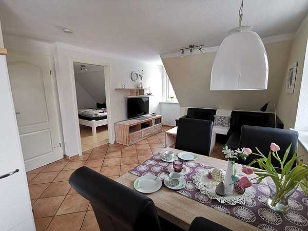 in Utersum auf FöhrDie Wohnung ist ca.. 70qm groß und Allergiker gerecht, mit festen Böden und Zentralstaubsaugeranlage für gesundes Raumklima ausgestattet. Im Wohn- und Esszimmer finden sie eine gemütliche Sitzecke mit Sat-TV,teilweise mit 3D TV und 3D blu ray Player, Radio/ CD- Spieler , Telefon und kostenlosen Wlan fürs Internet. Eine modern und voll ausgestattete Küche mit Geschirrspüler und Mikrowelle. Die Wohnung erstreckt sich über 2 Etagen und hat 2 Schlafräume mit Platz für 2-5 Personen(eventuell 6.Person möglich), sowie ein Duschbad. Bettwäsche, Handtücher sind natürlich inklusive. Für den Kleinen Urlauber haben wir selbstverständlich auch ein Kinderbett und einen Hochstuhl zur Verfügung.