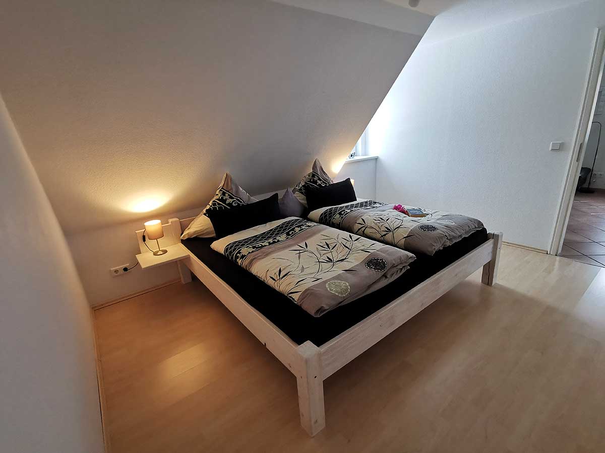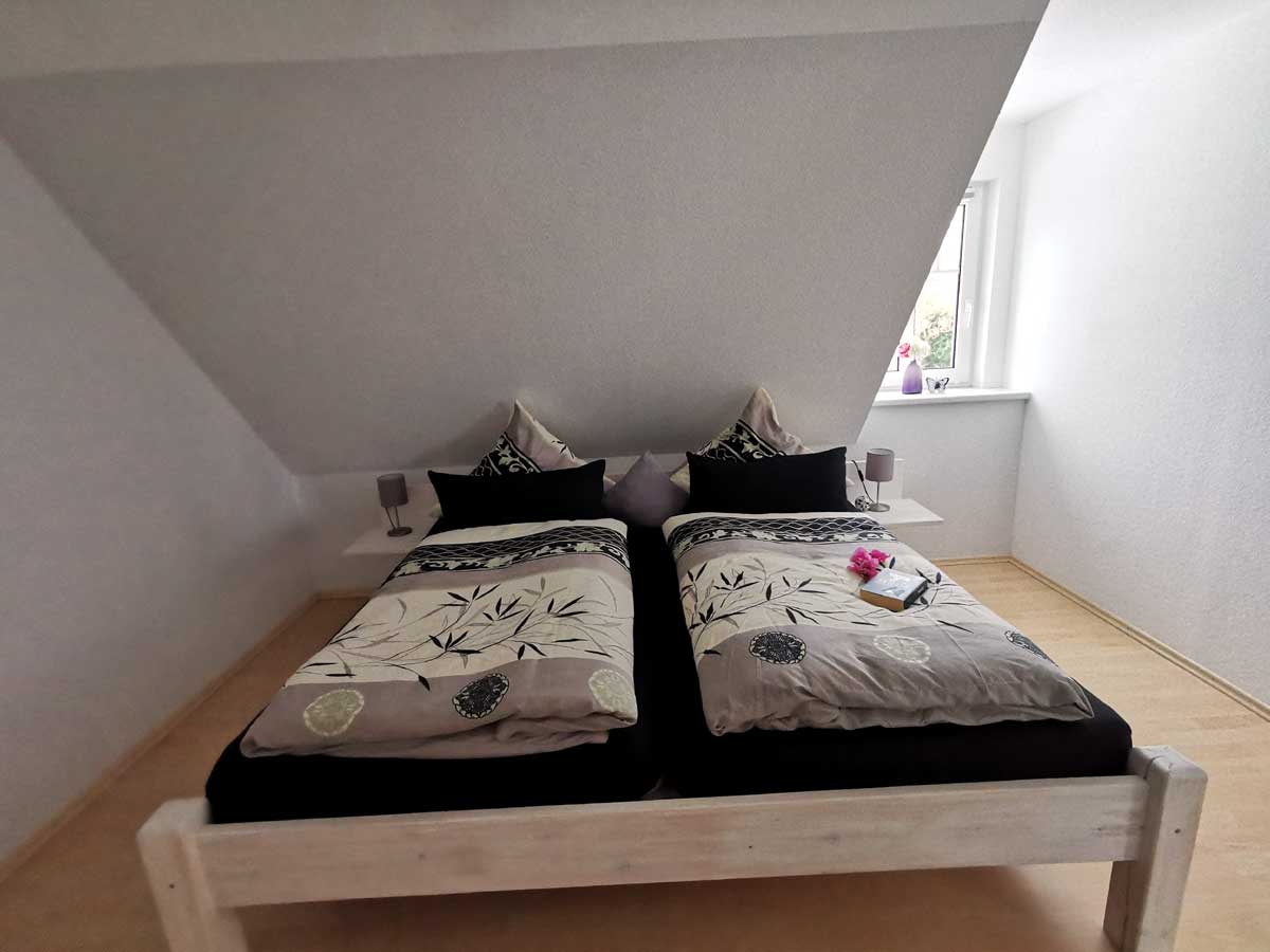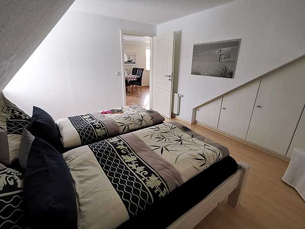 in Utersum auf FöhrDer Schlafraum im ersten Obergeschoss ist ca. 14qm groß, also das Elternschlafzimmer und hat ein Doppelbett von 200cm breite und 2 Metern Länge. Bei größeren Personen haben wir für sie eine Bettverlängerung und extra große Bettwäsche vorrätig. Der Fußboden ist mit Laminat verlegt. Im dazugehörigem Einbauschrank finden sie reichlich Platz um Ihren Kofferinhalt übersichtlich zu verstauen. Hell und bei Wunsch mit Fliegengitter ausgestatten werden sie hoffentlich nicht den ganzen Urlaub verschlafen.