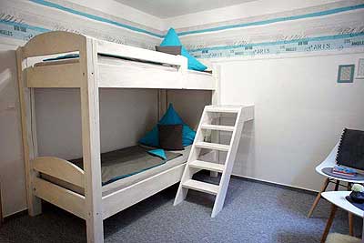 in Utersum auf FöhrDas Kinderzimmer oder zweiter Schlafraum hat eine Größe von ca. 11qm und bietet Platz für 2 Personen. Der Fußboden ist wie im Eltern Schlafraum mit Teppich ausgelegt und das Etagenbetten hat eine Größe von 90 x200cm. Dieses Bett hat eine Treppe und keine Leiter, so ist es Kinder leicht für jedermann zu benutzen. Hier gibt es auf Wunsch für die Kleinen Gäste ein Bettgitter oder Nässeschutz für die Matratze. Ein wenig Spielzeug damit sich Ihre Sprösslinge nicht langweilen ist ebenso vorhanden. Gerne möchten wir vor der Anreise wissen ob sie Mädchen oder Junge mitbringen sowie eventuelle Vorlieben erfahren, damit sich Ihre Kleinen auf Anhieb bei uns wohl fühlen. Im Kinderzimmers oder auch zweiter Schlafraum befindet sich ein ausreichend großer Einbauschrank für die sieben Sachen der neuen Bewohner.