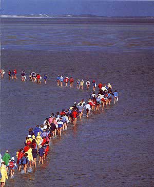 Obwohl die Wattwanderstrecke zwischen Föhr und Amrum während der Saison markiert ist, sollte man diese Tour nur unter kundiger Führung vornehmen. Neben einigen Privatpersonen bietet auch die Wyker Dampfschiffs-Reederei (WDR) eine Wanderung von Föhr aus an. Die Wattführer sind geschulte, ortskundige und gut ausgerüstete Kenner der örtlichen Verhältnisse. Neben Kompass, Signalraketen, Funkgerät, Rettungsseil, Seekarte und Tidenkalender führen sie unter anderem auch Verbandsmaterial und Rettungsdecken mit. Die Wanderungen beginnen auf Föhr am Parkplatz in Großdunsum, der etwas nördlich des Schöpfwerks Föhr West liegt. Hier sind auch die aktuellen Termine angeschlagen, die ebenso durch den monatlichen Veranstaltungskalender „Was ist los auf Föhr?" und die Kurverwaltungen in Erfahrung gebracht werden können. Einige Zeit, bevor das ablaufende Wasser seinen niedrigsten Stand erreicht hat, geht es vom Parkplatz etwas nördlich ins Watt hinaus auf das insgesamt recht gut begehbare Sandwatt-Gebiet. Die etwa sechs Kilometer lange Strecke kann man in zwei Stunden leicht bewältigen. Die gegenüberliegende Insel Amrum, die etwas südlich der Seevogelwarte an der Amrumer Odde angesteuert wird, erscheint an Tagen mit guter Sicht zum Greifen nahe. Aber wenn man sich dann auf den Weg macht, erkennt man, wie leicht man solche Entfernungen falsch einschätzt. Der wahre Wattkenner, der auch noch etwas für seine Füße tun will, geht natürlich barfuß. Zudem empfehlen sich Shorts oder eine Badehose unter der langen Hose, da kurz vor Amrum ein etwas tieferer Priel, wo das Wasser leicht bis zu den Oberschenkeln reichen kann, durchwatet werden muss. Auf Amrum kann man von Norddorf aus per Bus nach Wittdün und dann mit der Fähre wieder nach Wyk auf Föhr zurückfahren. Auch umfangreichere Touren, die noch eine Inselführung mit Wanderung auf Amrum einschließen, werden angeboten. Was ist eine WattwanderungDie Tierwelt des Watts
